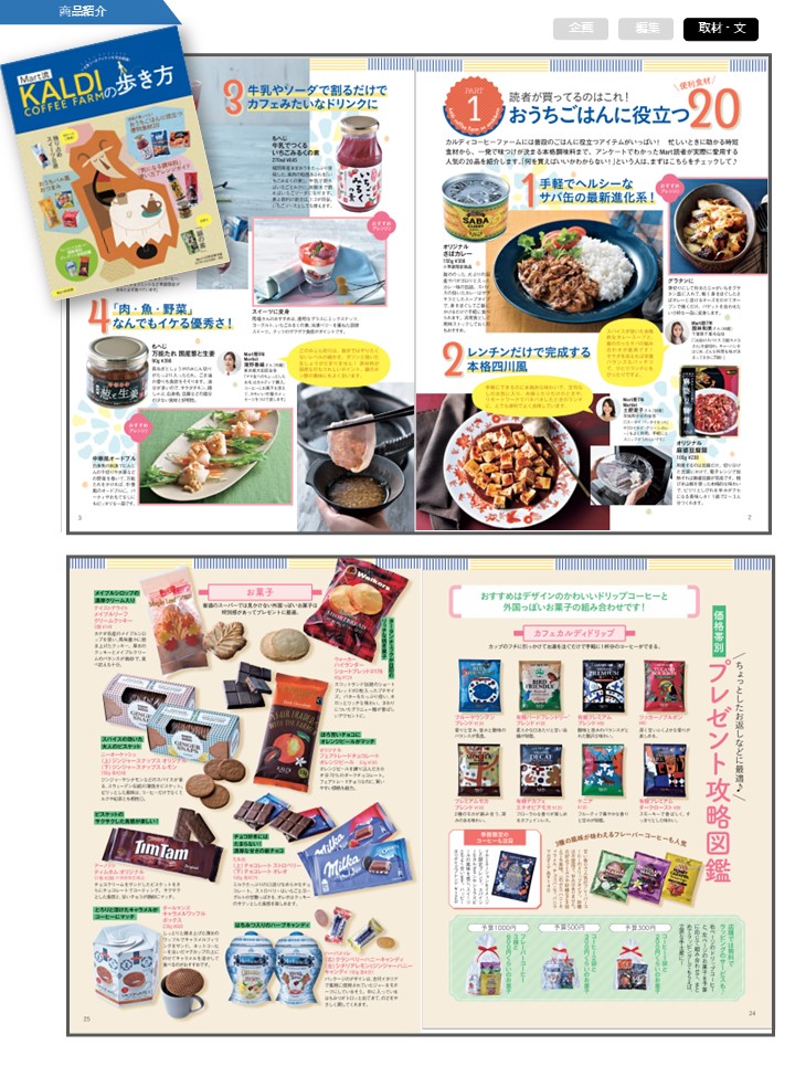 「カルディの商品の使い方」「どの商品が気に入っているか」など、読者アンケートをもとに誌面を構成。注目商品をピックアップし、おすすめのアレンジ方法など、読者のリアルな声と一緒に紹介しました。