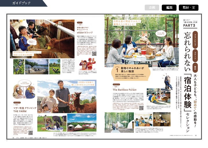 読者アンケートをもとに、切り口となるテーマをいくつか見い出し、家族の思い出に残る夏の体験を提案したガイドブック形式のページです。画像は全て、施設に提供してもらって構成しています。