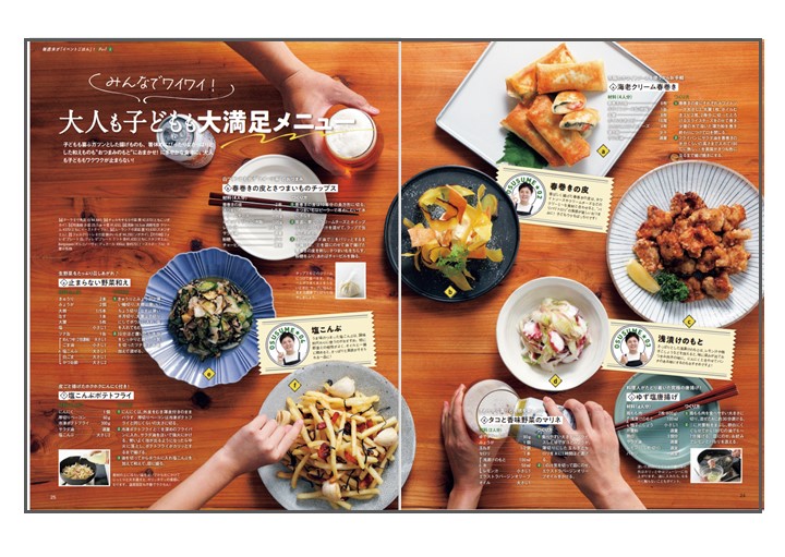 「家呑みでは、たくさんのおつまみを並べたい。でも手間がかかりすぎるのはイヤ!」そんな読者の声を受けて、“おつまみのももと”となる市販食材を活用したレシピを提案。家族みんなで楽しめるように、見た目からワクワク感が伝わるページとしました。